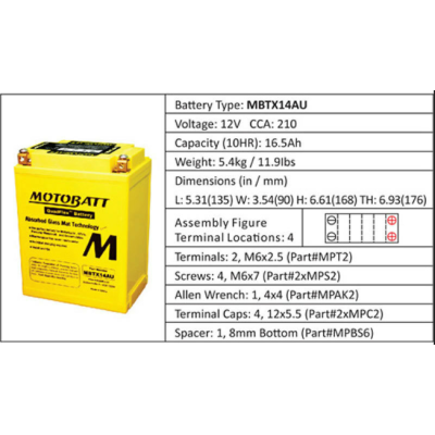 Power Experience up to 30% more capacity and power with the same size as competitor batteries, thanks to its exclusive design Safe No need to add acid and risk any accidental spillages Durable Thanks to its technology and high quality AGM it is extremely resistant to vibrations or weld breakages Maintenance Free Fully sealed and factory activated, it requires no maintenance other than keeping it charged in storage Ready to go With a voltage of over 12.5V the battery is ready to use right away New improved solid mounted terminals with threaded inserts.